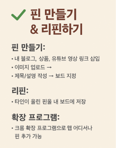 - 확장 프로그램: 크롬 확장 프로그램으로 웹 어디서나 핀 추가 가능
